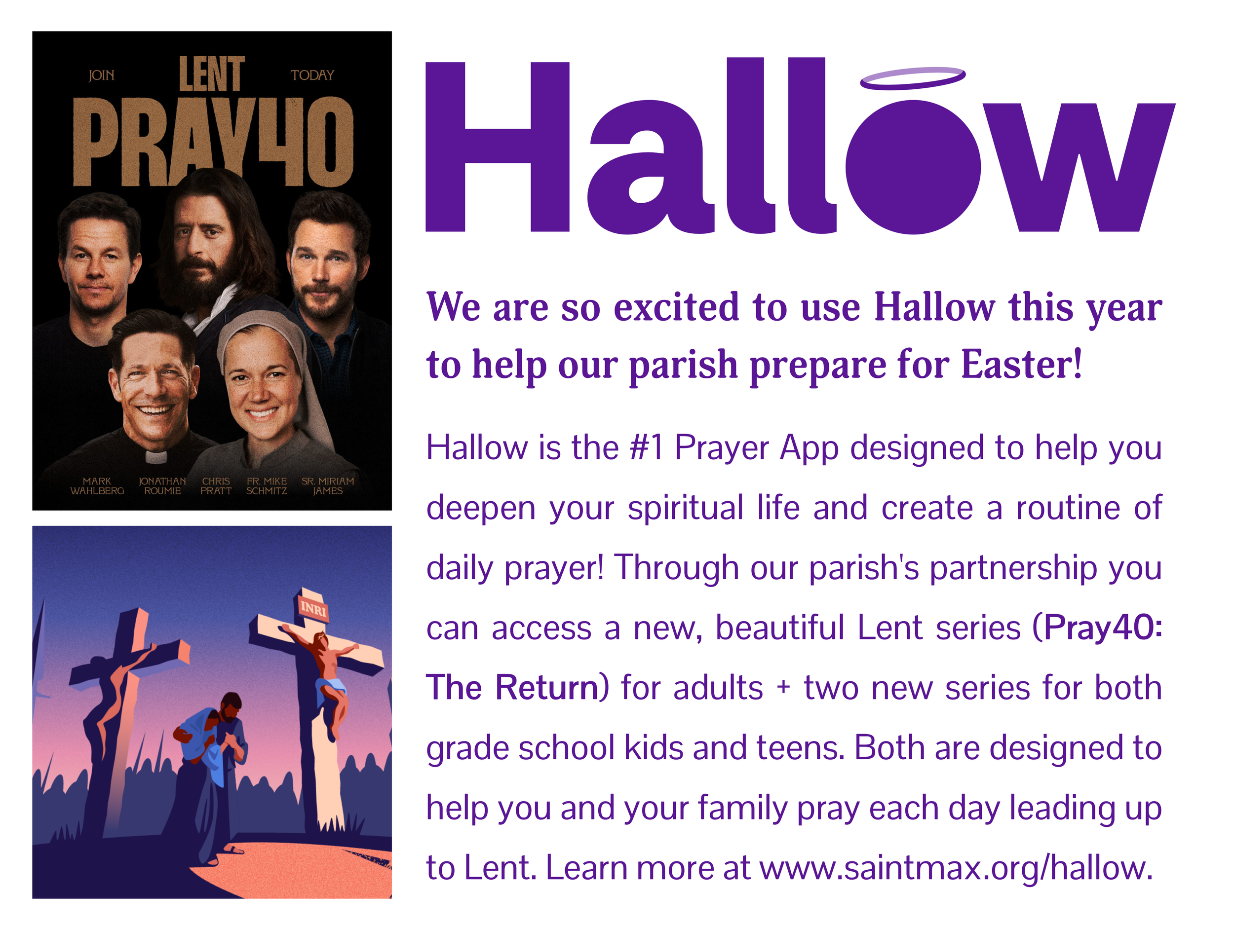 We are so excited to share that our parish and schools have partnered with Hallow, the #1 prayer app, for the next two years. Through prayer and meditation rooted in the Catholic faith, Hallow helps people grow closer to God and find peace. This investment in our partnership with Hallow is aimed at helping our parishioners create a routine of daily prayer!